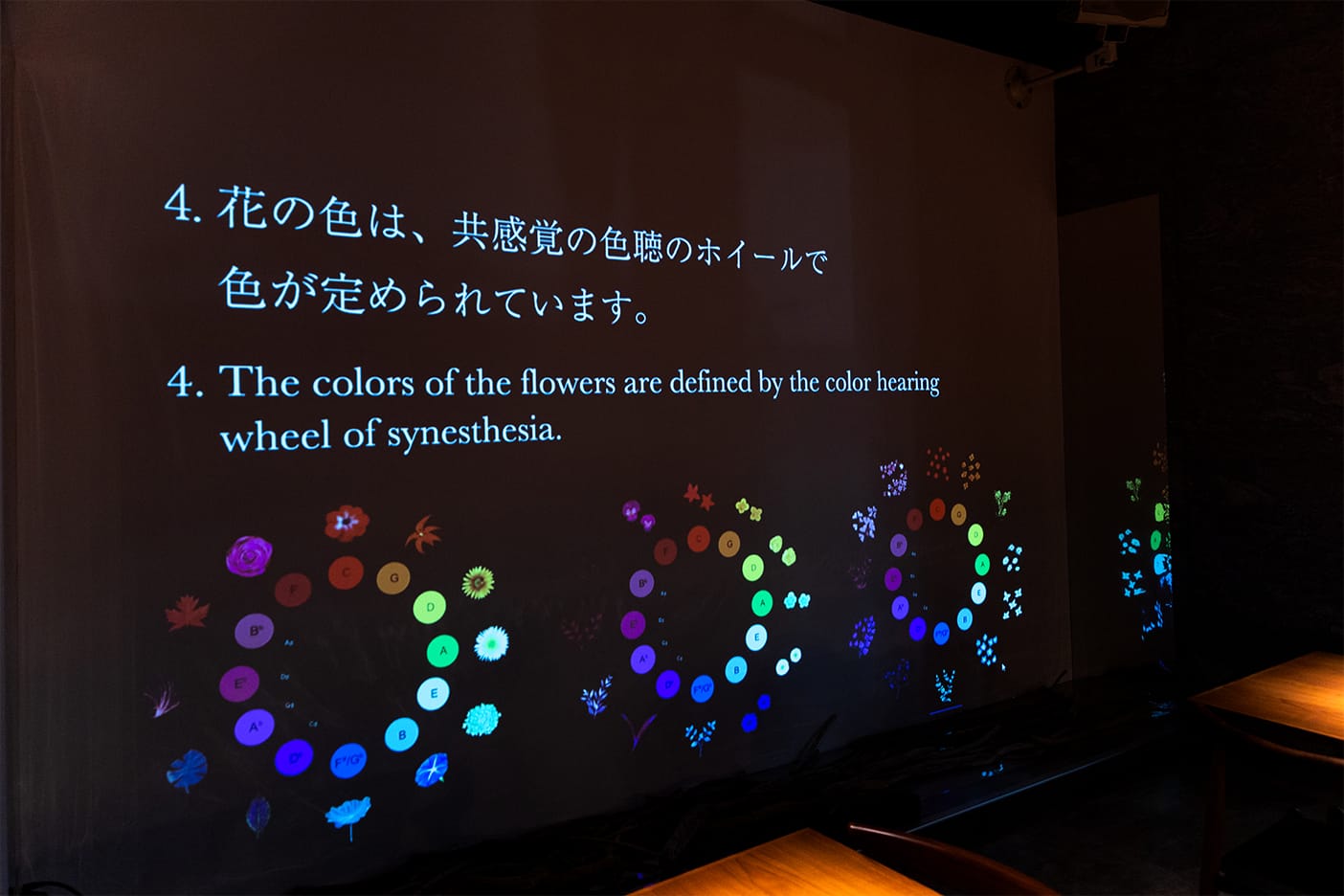 現在、私が創作しているのは、色覚と聴覚による共感覚をテーマにした「演奏の花」というインタラクティブアートです。ピアノの音を鳴らすと、共感覚の色聴をもとにした花の映像がスクリーンに現れ、花畑が生成されます。自由に音を鳴らして感覚の世界を広げていってほしいと、音のデザイナーと一緒にアイデアを膨らませていきました。