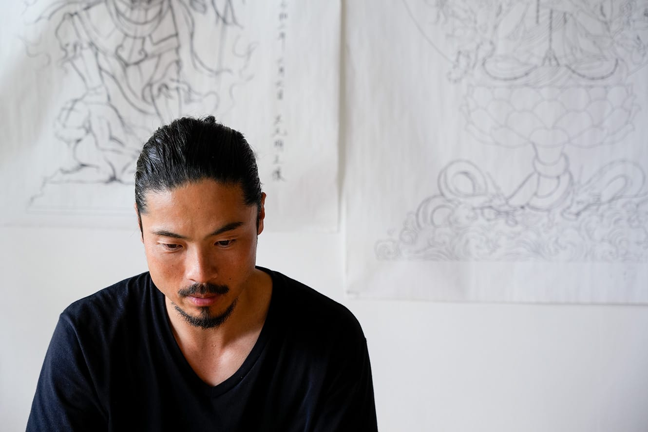 アルバイトをしながら作品制作に明け暮れていたときです。「友人の仏師が、十一面観音菩薩像の服に柄を入れる職人を探しているから一回行ってみないか」と、兄が声をかけてくれました。向かった先は、代々続く仏師の工房。そこでものすごい衝撃を受けるんですね。ファッションは流行とともに淘汰されていく、サイクルの早いものづくり。かたや仏像は1000年後、2000年後を考えたとても長いスパンのものづくり。自分が存在していない時代を見据え、いかに恥のない仕事ができるかという仏師の方の心構えに清々しさを感じ、スケールの違いに打ちのめされた。その日のうちに思いは固まり「弟子にしてください」とお願いしました。