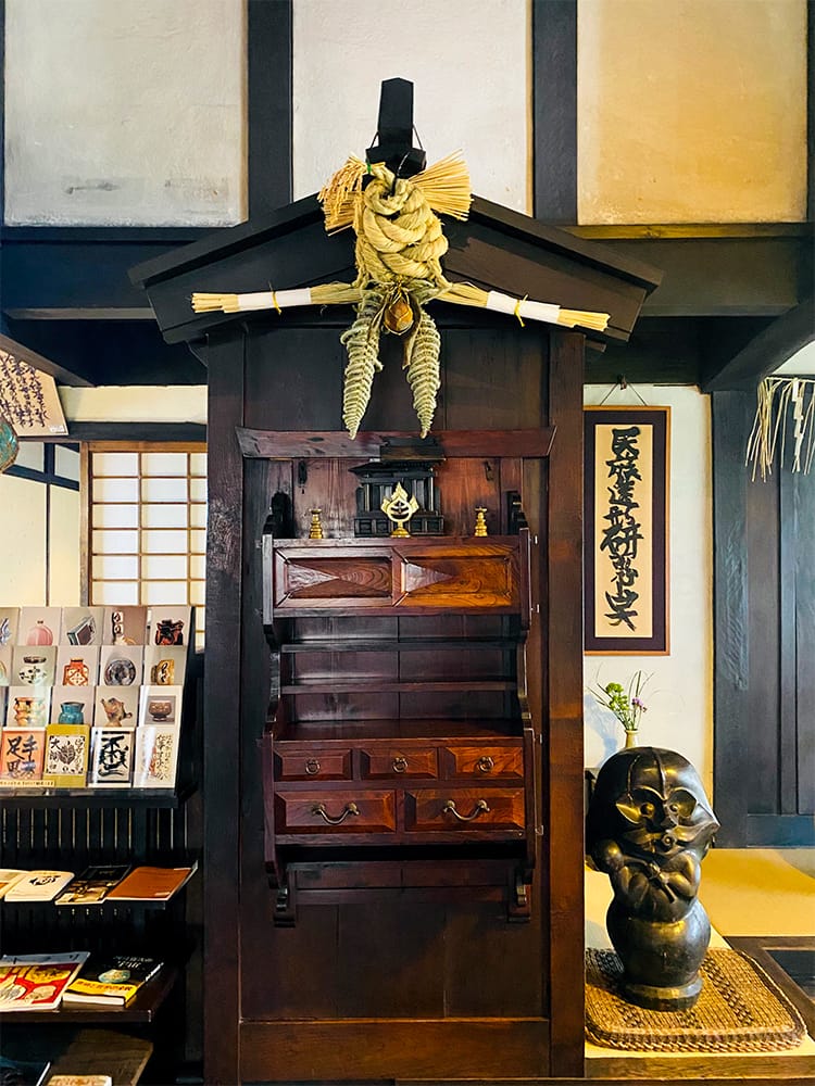 そういう時、おもしろいことに出会いがあるんですね。思想家の柳宗悦さんや柳さんを通じて知る木喰仏(もくじきぶつ)、後輩の陶芸家、濱田庄司さんがイギリスより持ち帰った雑器スリップ・ウェア…。当初、柳さんは寬次郎のスタイルに批判的で、二人はあまりいい関係ではありませんでしたが、関東大震災を機に柳さんが京都に疎開、その美しい仮住まいに濱田さんが寬次郎を引っ張っていったんです。そこで見た木喰仏に寬次郎は魅了され、一瞬にして二人の仲は氷塊し、生涯の友になります。寬次郎と柳さん、濱田さん。この3人が出会った京都が民藝のスタート場所となり、民藝運動へとつながっていきました。
