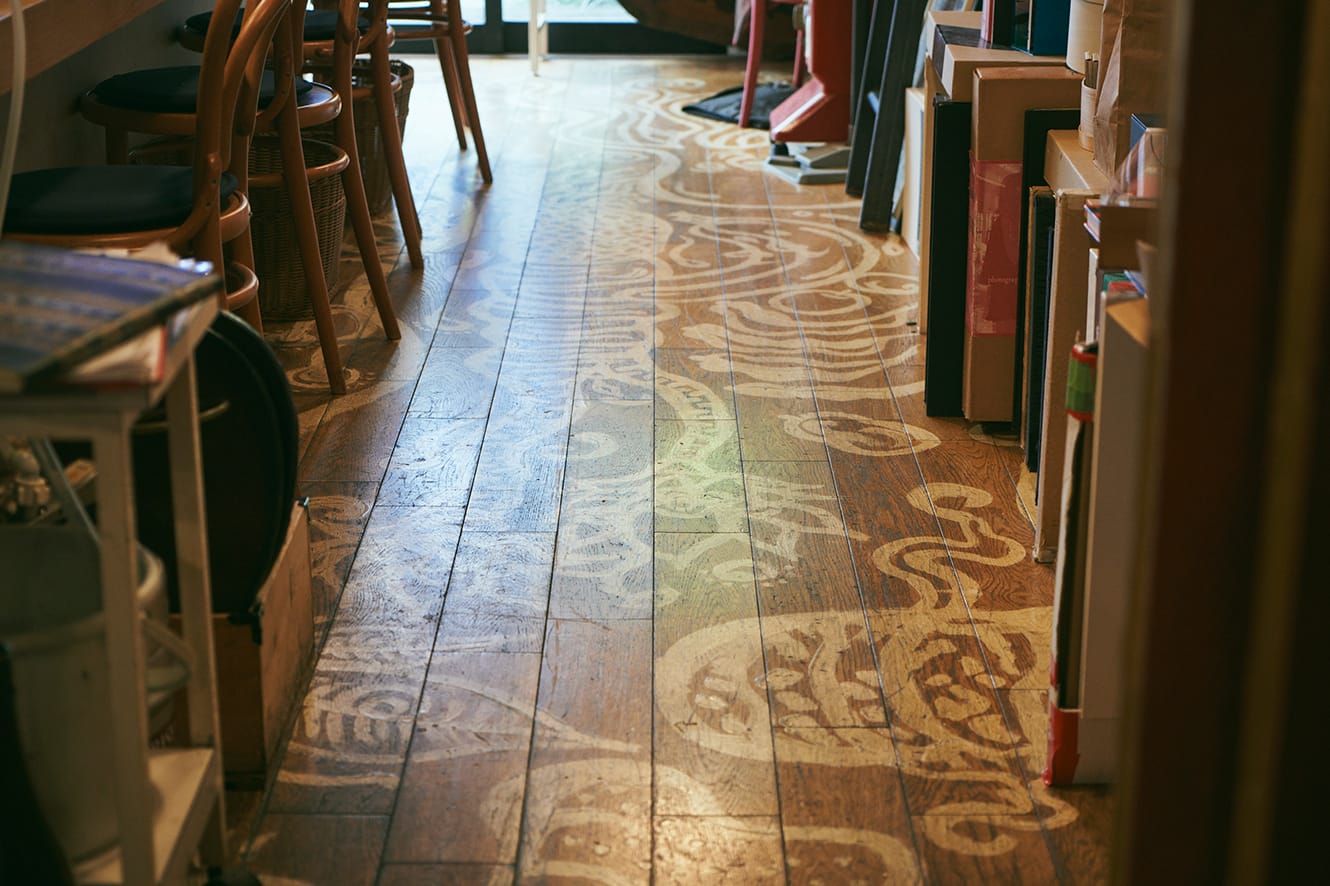 飯沢内装は、昔からの知り合いであるデザイナーの橋本夕紀夫さんです。彼から「飯沢さん、床に絵を描いてよ」と言われて、床全面に白いペンキで1日半かけて描き上げました。ここまで大きな絵を描いたことは一度もなかったけど、「なんとかなる」と妙に自信があってね。実際になんとかなりました(笑)。普段とらない体勢を続けて足腰はパンパンでしたけど。「生命の樹」が床絵のタイトルです。