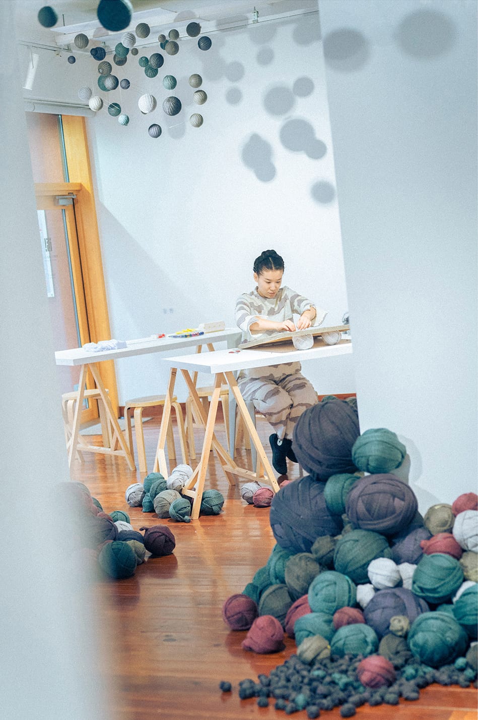 東京都渋谷公園通りギャラリーでの滞在制作・展示では、毎日、自分のコンセプトや残糸問題を含めた環境問題、渋谷という街、地球史的な視点からの話などについて来場者の方とじっくりお話をしています。どちらの意見が正解というのもなく、哲学的というか答えのない対話をするのが心地よくて。会場には私が今テーマとしていることを少し拡張し、考えやアイデアを共有する場として「もしも世界が糸と自分だけになったら、どうやって生き延びますか」という問いを設け、来場者の方が付箋を残せるボードも用意しました。