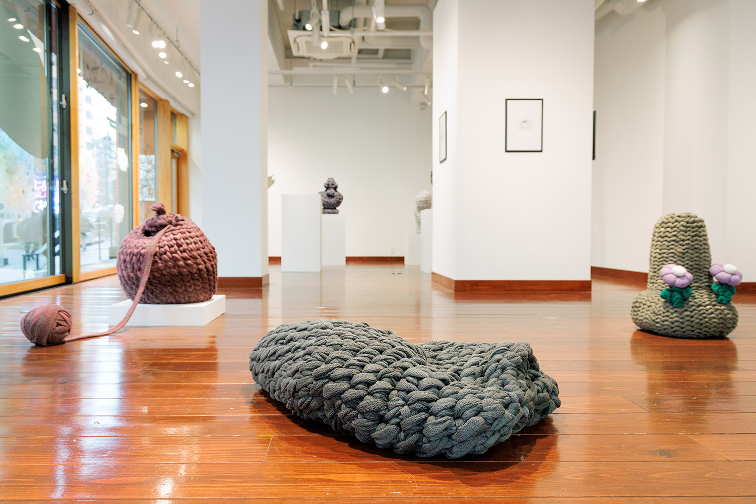 私と編み物との出会いは小学生のときです。母からマフラーの編み方を教わったのが最初で、そのときは特に面白味を感じず、編み地も幅が一律でなくやめてしまったんですが、もともと手芸は好きでした。大学3年の時、友人から帽子の編み方を教わったことがきっかけとなって、卒業制作では表面を糸で編んだ地球儀《ManGlobe》をつくりました。五大大陸に目がついていて、人が近づくと瞬きをするんです。世界の人と友達になりたい!というコンセプトの作品です。
