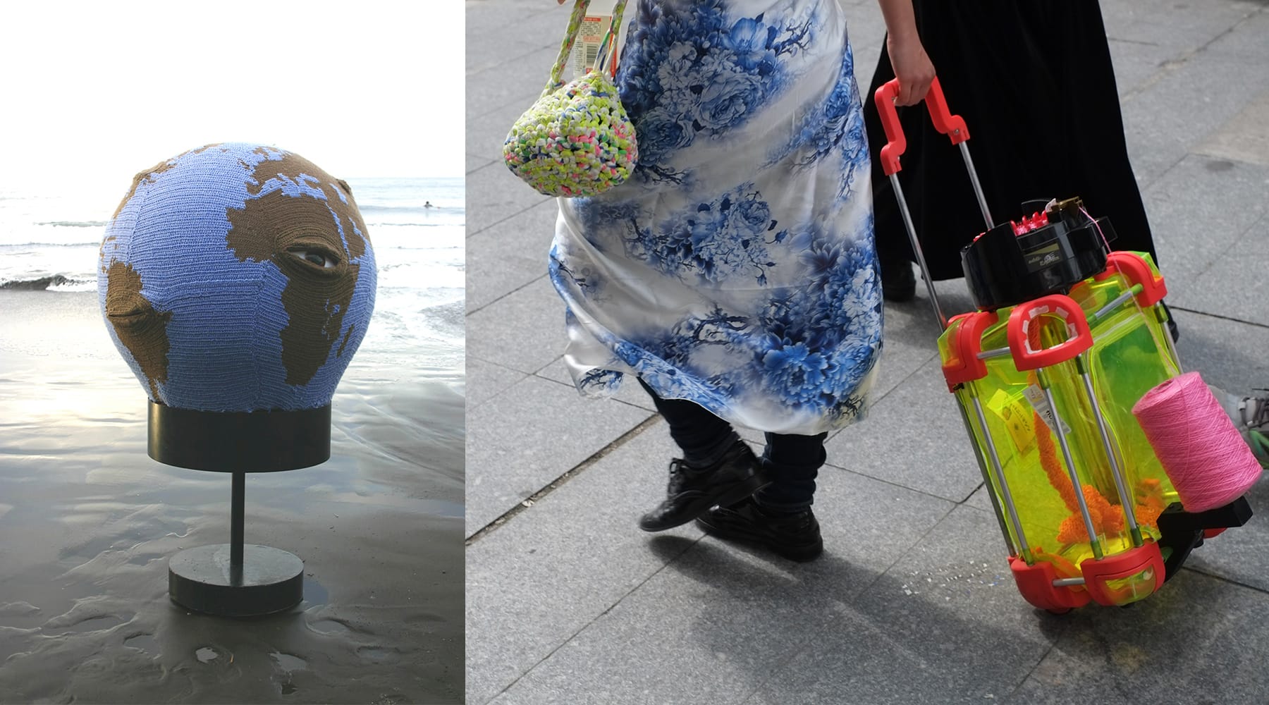 その後は、糸と針さえあればどこでもできるという編み物の良いところを活かして、訪れた先々でそこにある物を編み包んで自分の痕跡を残していくという作品をつくったり。子供が生まれたときは、スーツケースと編み機が合体したマシンを制作しました。子連れで散歩する際にスーツケースをゴロゴロ引くだけで自然と作品ができあがる《旅するニットマシン》という作品です。