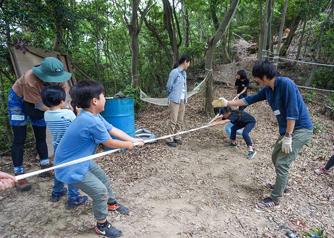 薮を伐り拓いてトイレを作ったり、綱引きをしたり、子どもも大人も一緒になって里山時間を楽しみます