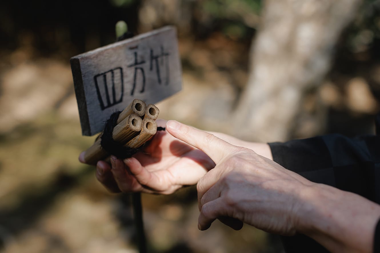 「後嵯峨天皇が四方竹を四本束ねて切ってみるようにと葉室の祖先に申され、その切口が見事な菱形をしていたので葉室の家紋にとお言葉をいただいたと伝えられています」