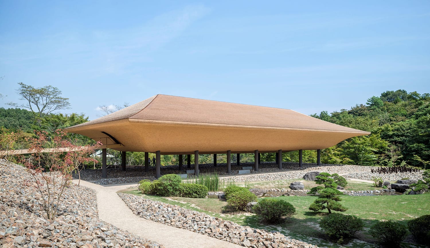 富永境内は約7万坪で、様々な建物の間を縫うようにして庭園が配置されています。寺務所となっている「松堂(しょうどう)」は建築史家・建築家の藤森照信氏による設計で、山陽道から瀬戸内一帯を象徴する植物であり、禅のイメージに最も近い赤松を多用しています。屋根の手曲げ銅板は、地元をはじめ関西や関東からいらしたボランティアの方々に手伝っていただき、一つひとつ曲げて設置しました。よく見ると形が不揃いで味わいがあるんですよね。